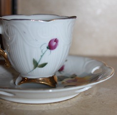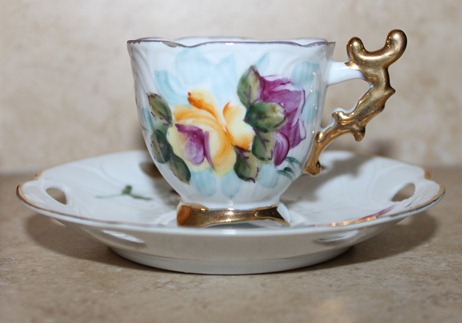 The set itself is all white, with the gold trim along the edges of both the cup and the saucer. Along the edge of the saucer, tear drop shaped cut outs line the gold edging. If you click to enlarge these photo’s (below) you will see the cup is hand painted…I can even feel the paint when I rub my fingers along the dainty flowers…