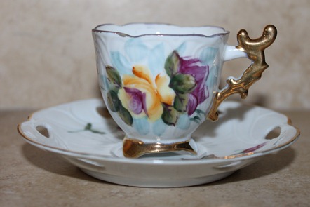 The only markings on the bottom of this sweet tea cup is “MADE IN JAPAN”…but this sentimental gift says, “SOMEONE THOUGHT OF ME”!!! My son’s girlfriend picked this Petite Little Tea Cup up from an antique store with me in mind. She knows (and has seen first hand) that I get so excited when I am able to find one to add to my Three Footed Tea Cup Collection. This one is very different than the ones I currently own…(between you and me, I don’t think it would be considered a three footed tea cup by most) ~ in my heart, IT IS because of the thoughtful gesture…